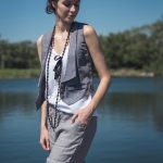 Kamizelka uszyta z 100% lnianej tkaniny o skośnym splocie w kolorze stalowo niebieskim, z przodu zapinana na guziczki kokosowe, tył wiązany kokardką. Może być noszona luźno do sukienek , spódnic oraz spodni natomiast zapięta pięknie podkreśla sylwetkę.