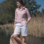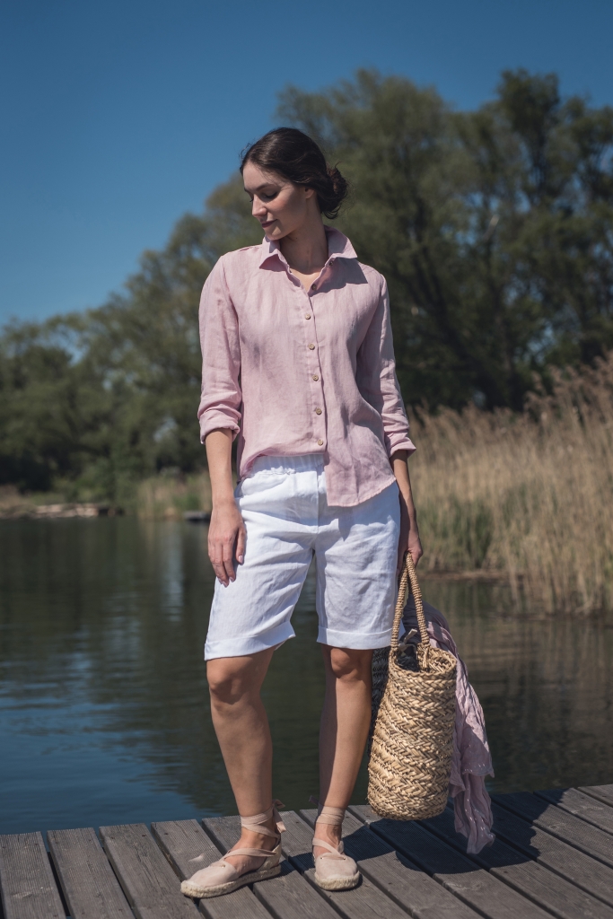 Koszula lniana uszyta jest z przyjemnej w dotyku, zmiękczanej tkaniny lnianej w kolorze jasno różowym o gramaturze ~155 g/m2.