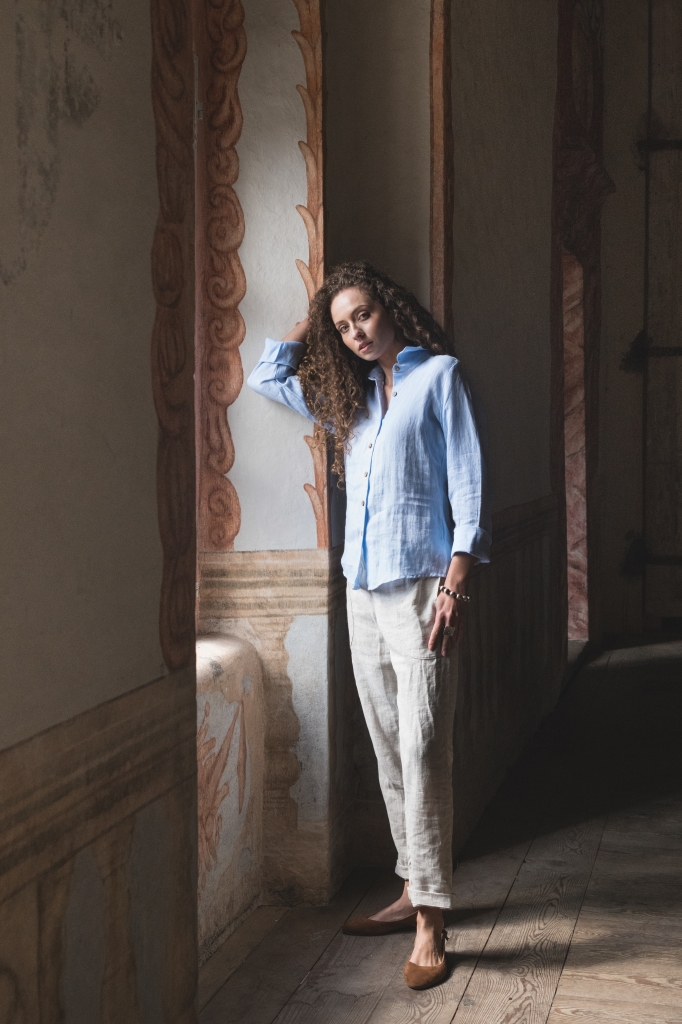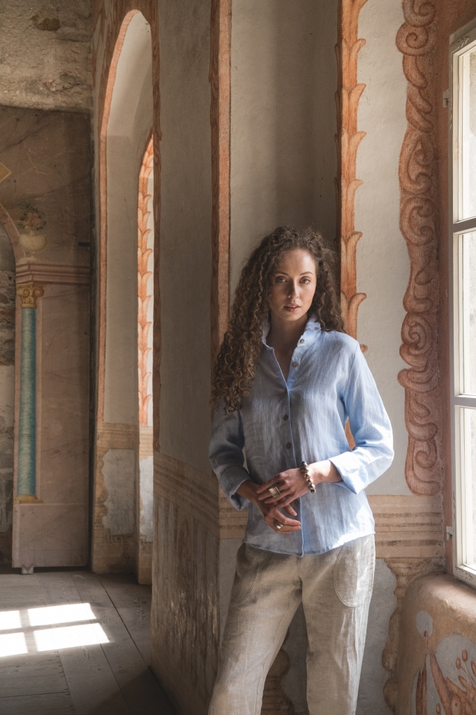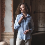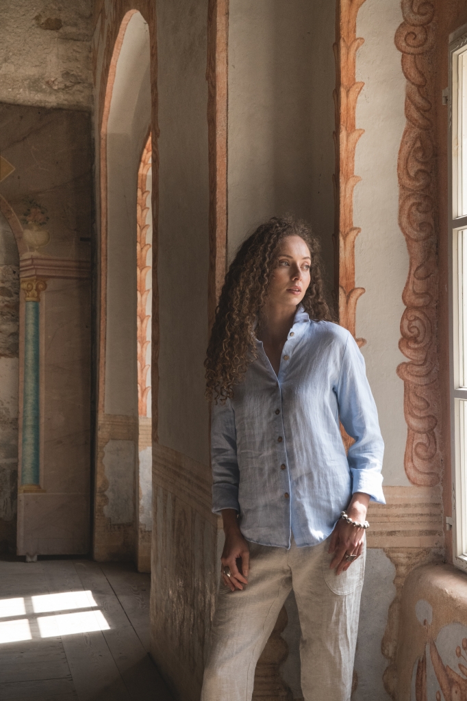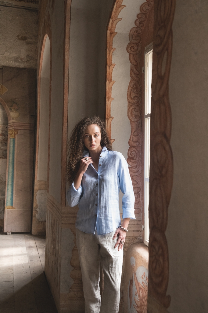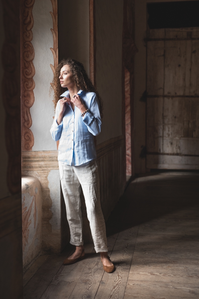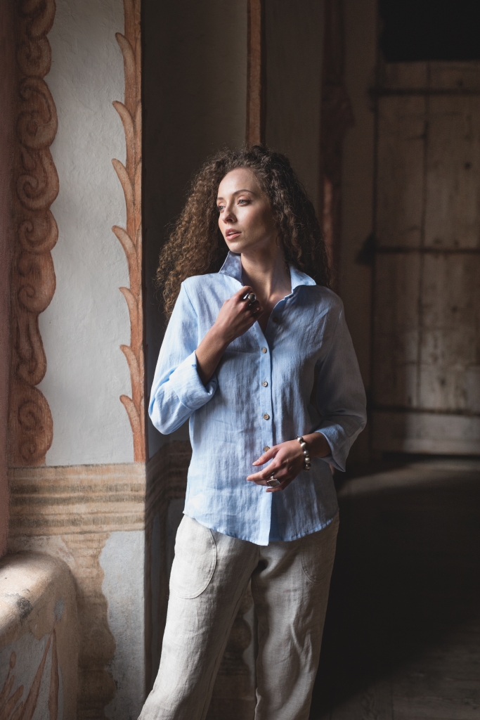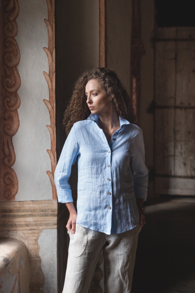 Koszula lniana uszyta jest z przyjemnej w dotyku, zmiękczanej tkaniny lnianej w kolorze błękitnym o gramaturze ~155 g/m2.