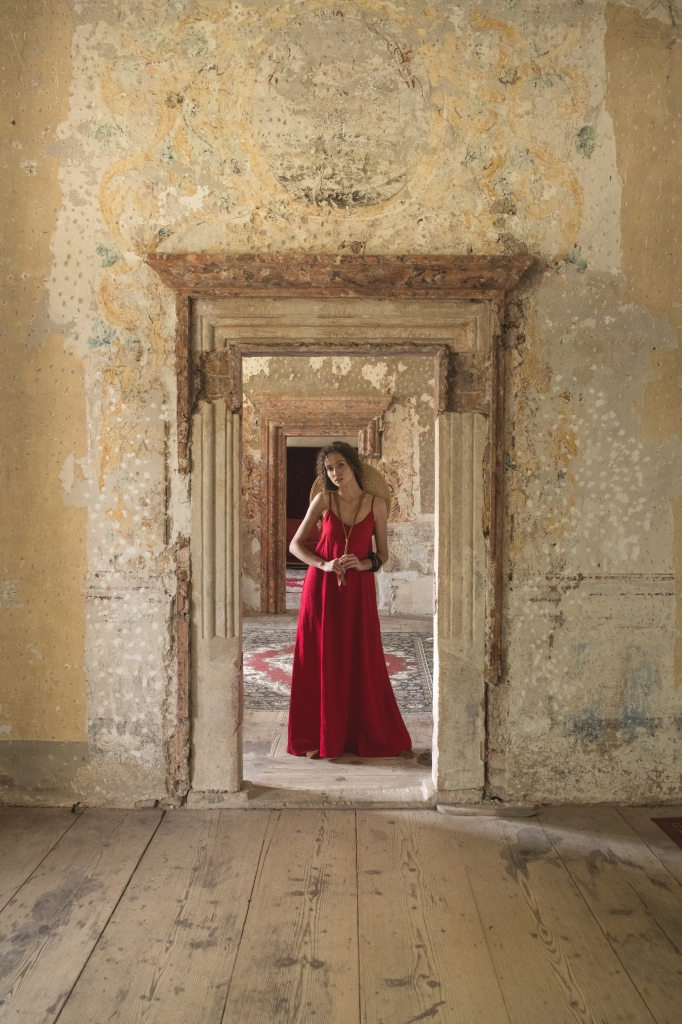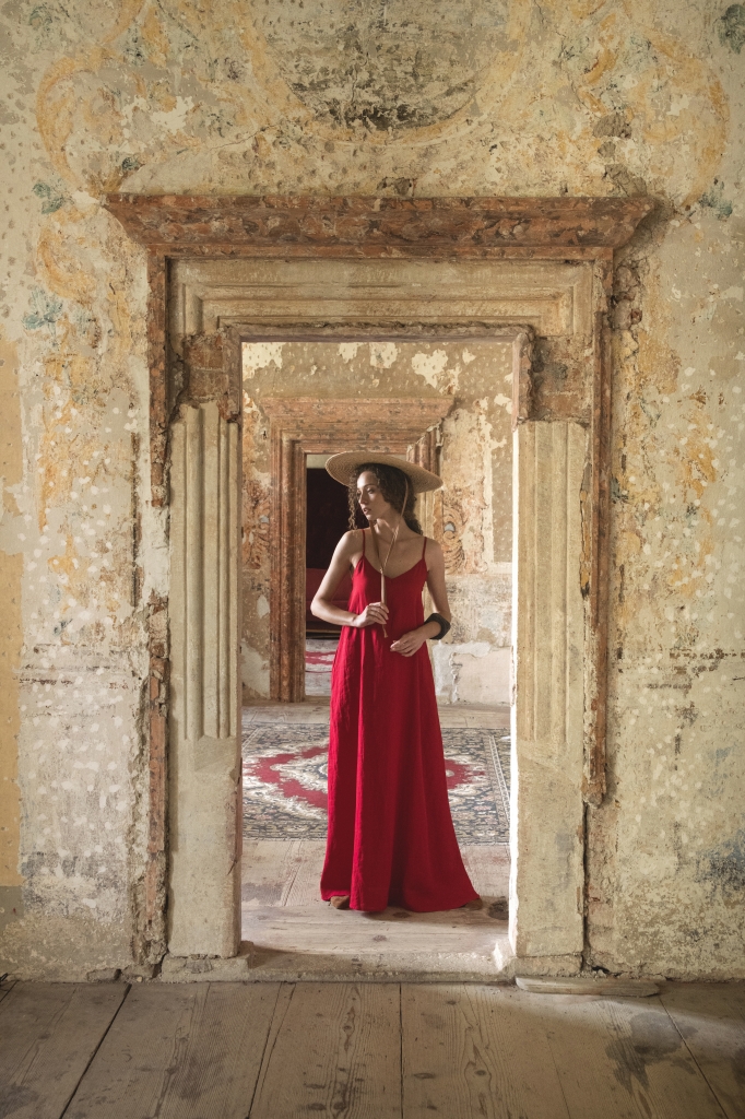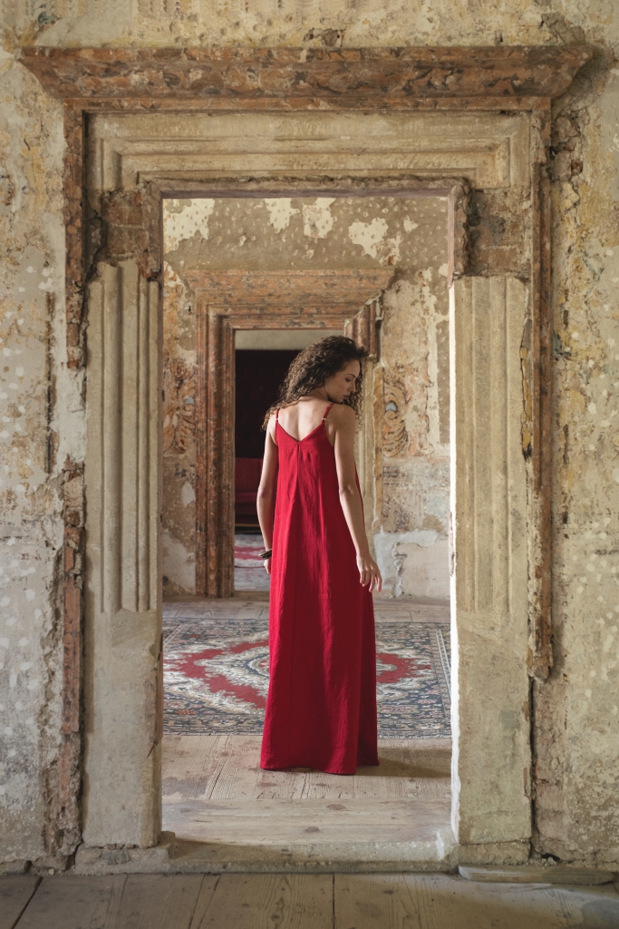 Długa sukienka na cienkich, regulowanych ramiączkach wykonana z miękkiej w dotyku 100% tkaniny lnianej w kolorze pięknej głębokiej czerwieni. Po bokach sukienki są kieszenie