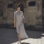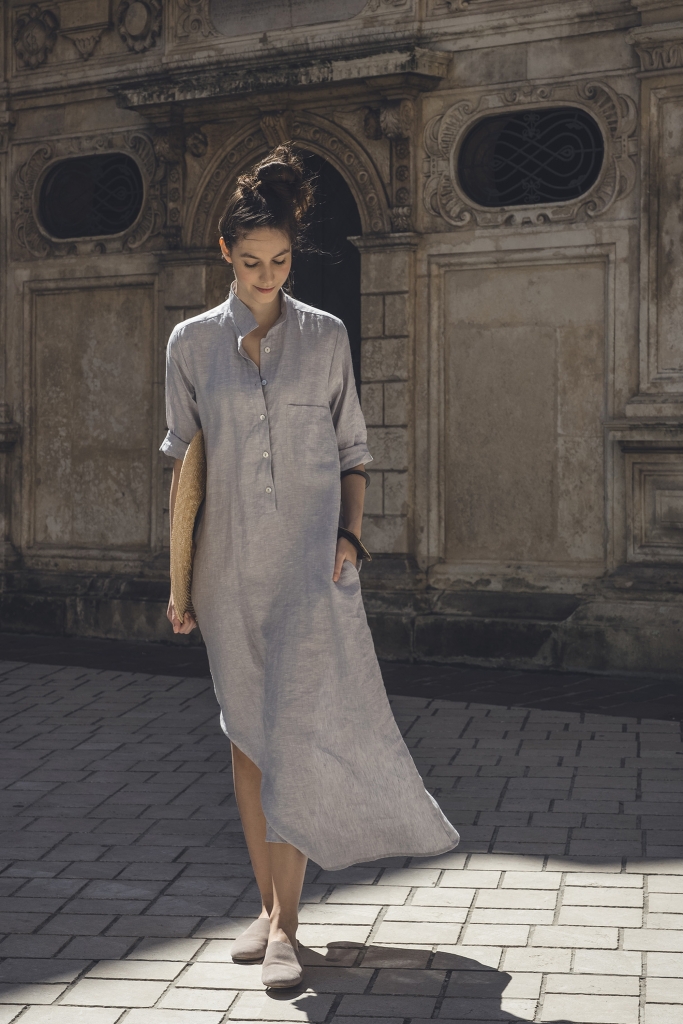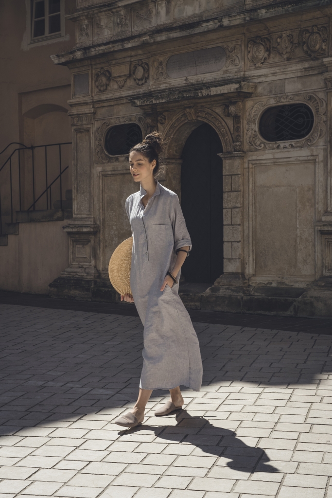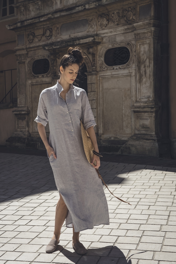 Długa sukienka koszulowa w kolorze gołębim, uszyta jest z przyjemnej w dotyku, zmiękczanej tkaniny lnianej. Po bokach znajdują się rozcięcia ~30cm. Przód zapinany jest na guziczki kokosowe, na bokach są kieszenie.