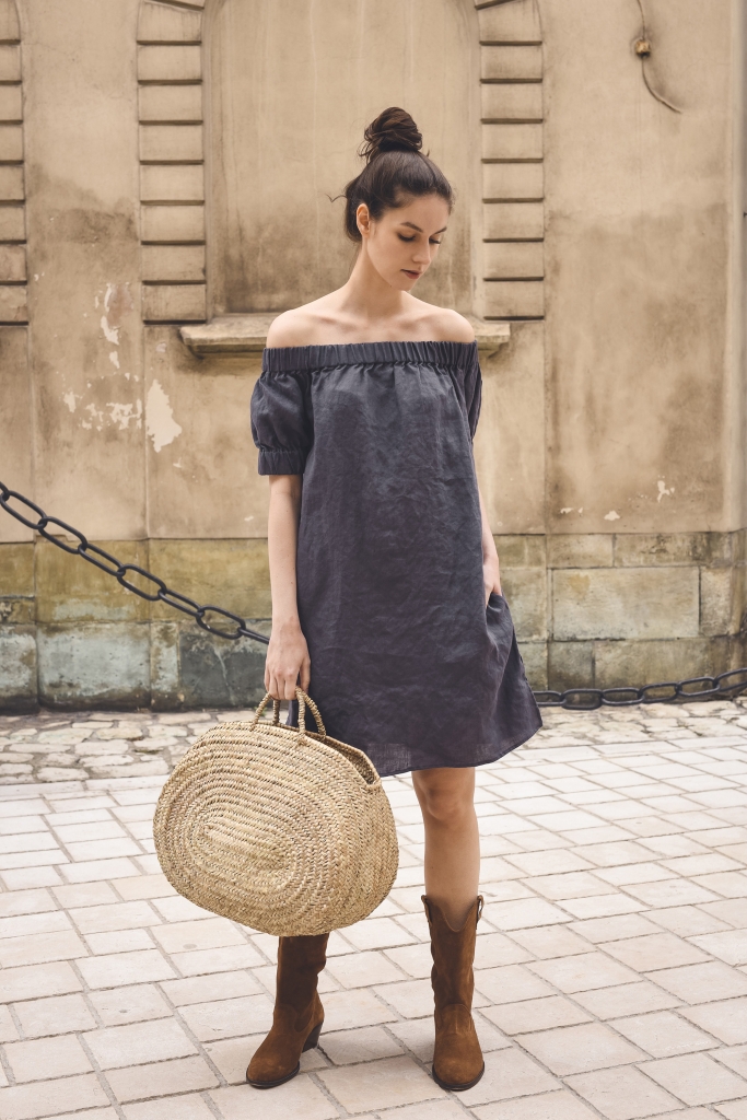Sukienka lniana w kolorze grafitowym z bocznymi kieszeniami i rozcięciami na dole o wysokości ~10cm. Przy dekolcie i rękawach wszyta jest 4cm guma, która reguluje głębokość dekoltu i dopasowuje się do sylwetki. Modelka na zdjęciach ma 174cm wzrostu