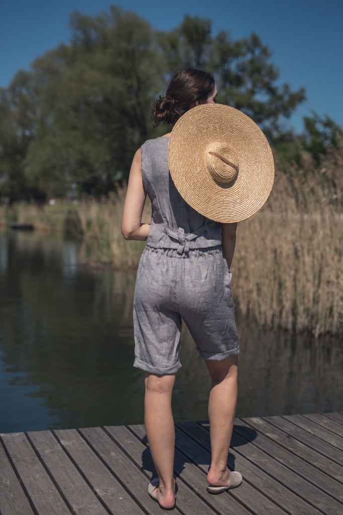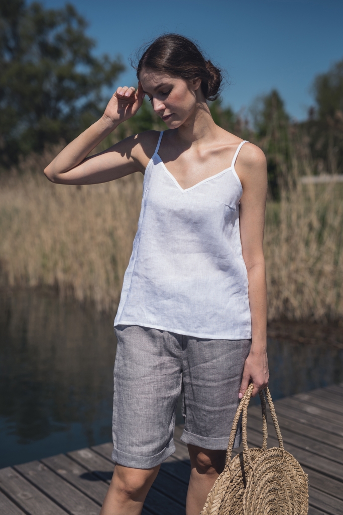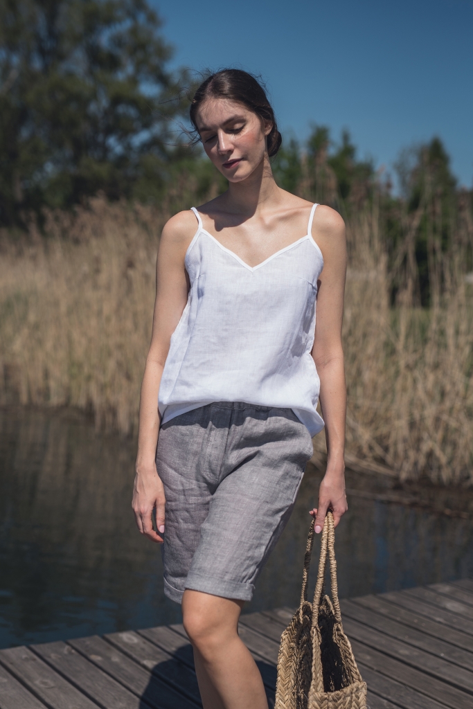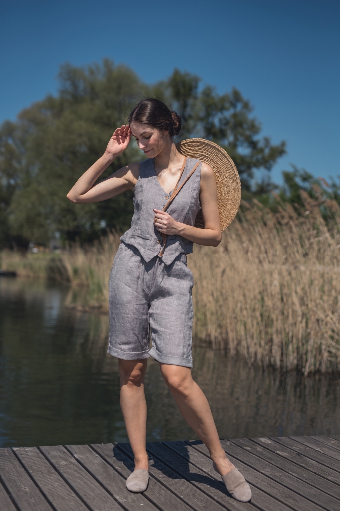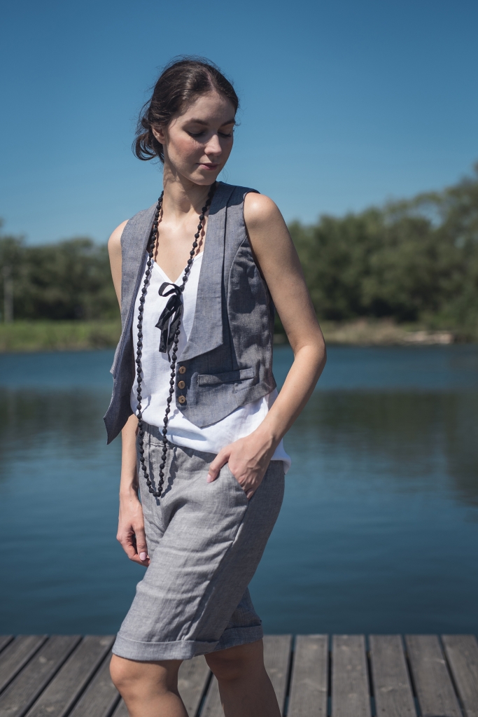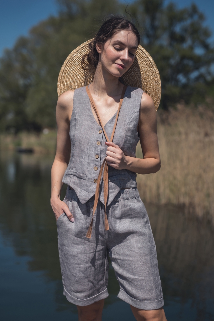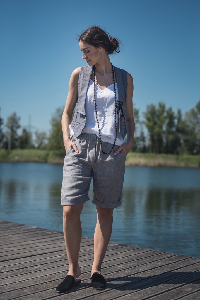 Lniane spodenki uszyte są z wyjątkowo mięciutkiej 100% tkaniny lnianej o splocie skośnym jednostronnym i gramaturze ~170g/m2 w kolorze jasny popiel.