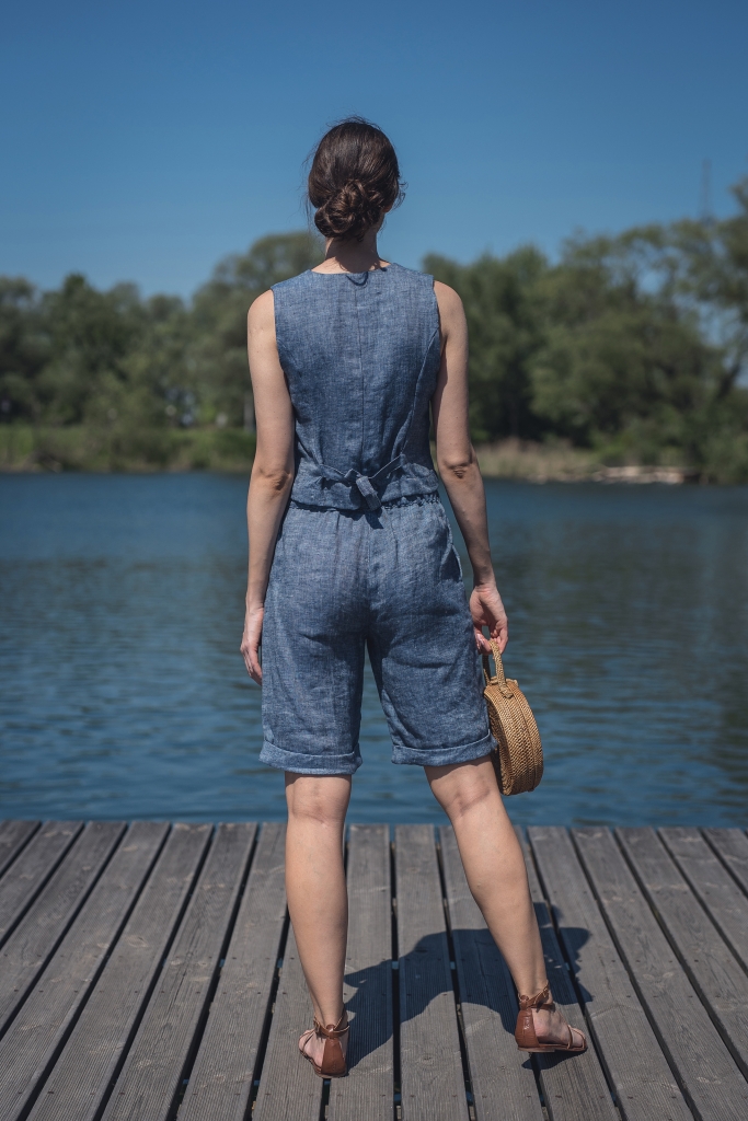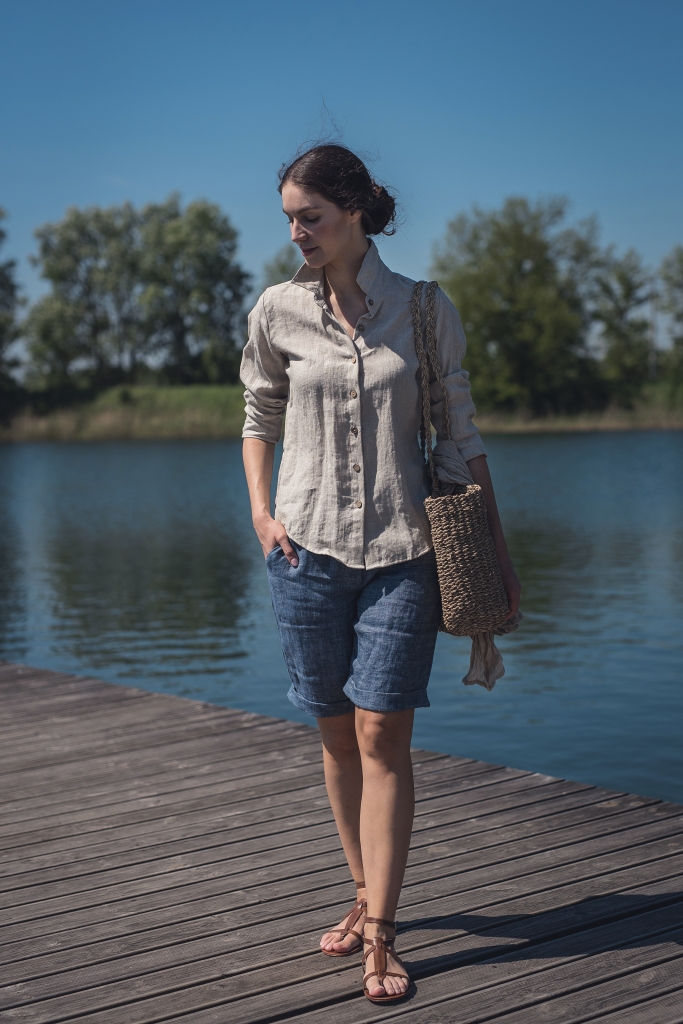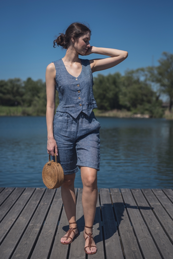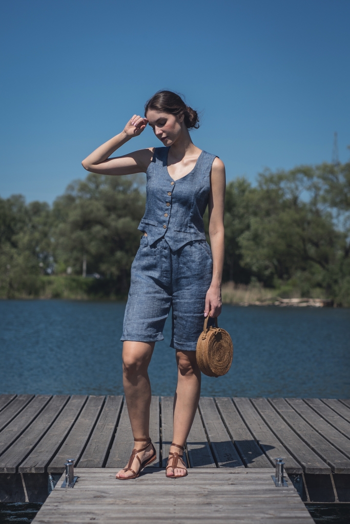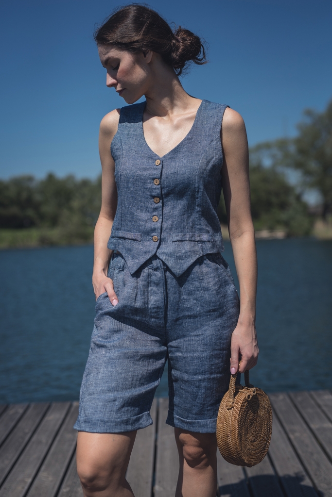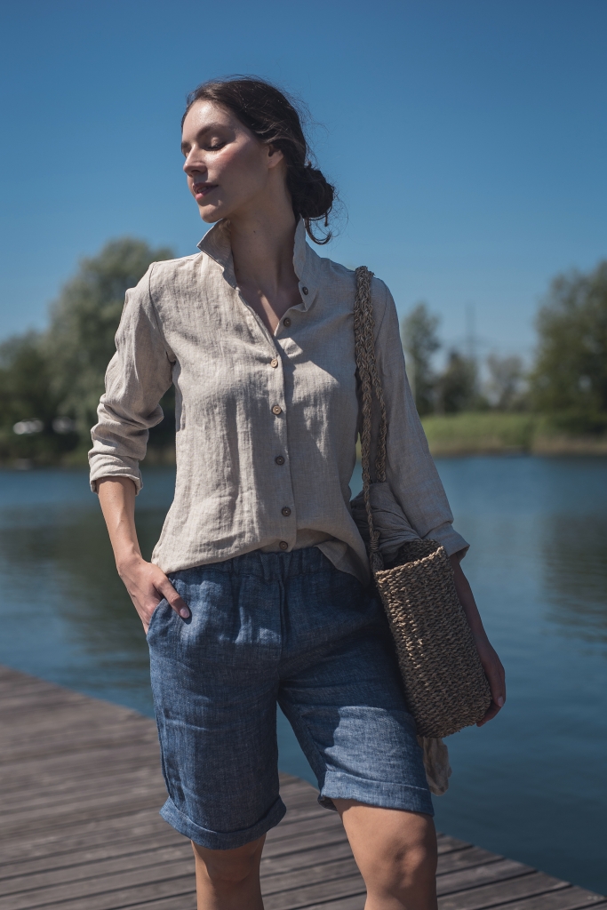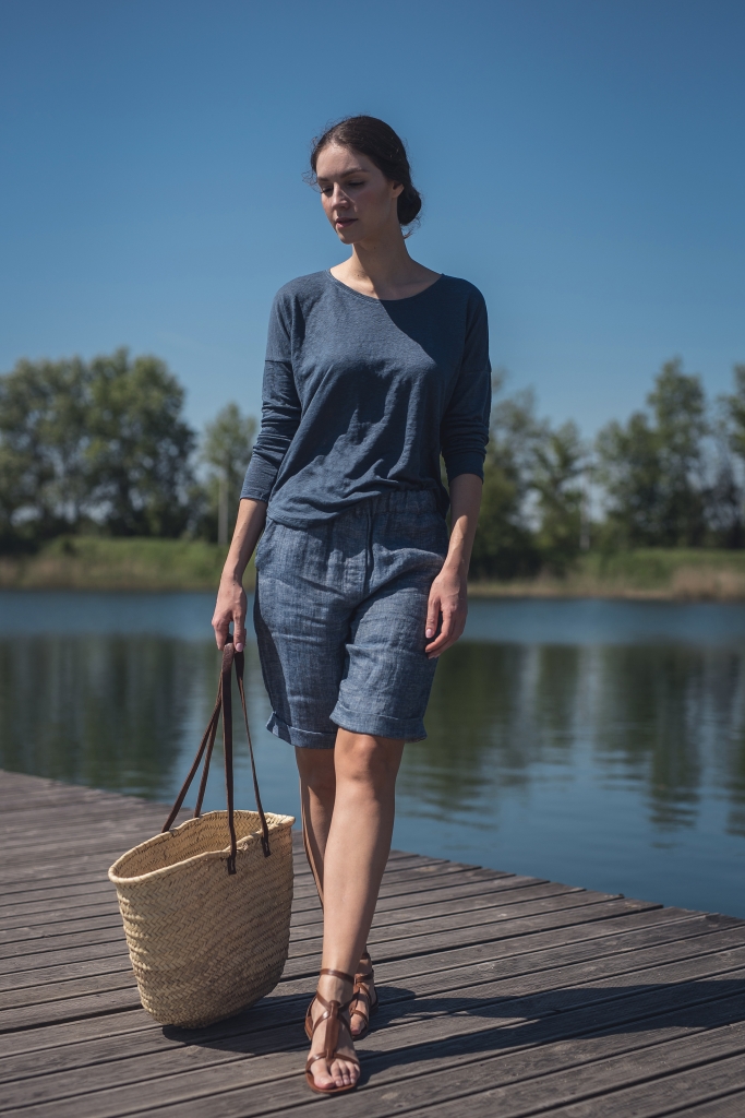 Lniane spodenki uszyte są z wyjątkowo mięciutkiej 100% tkaniny lnianej o splocie skośnym jednostronnym i gramaturze ~170g/m2 w kolorze ciemno niebieskim.