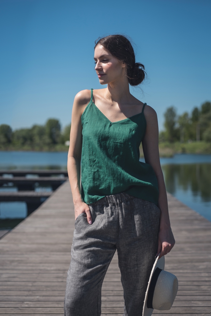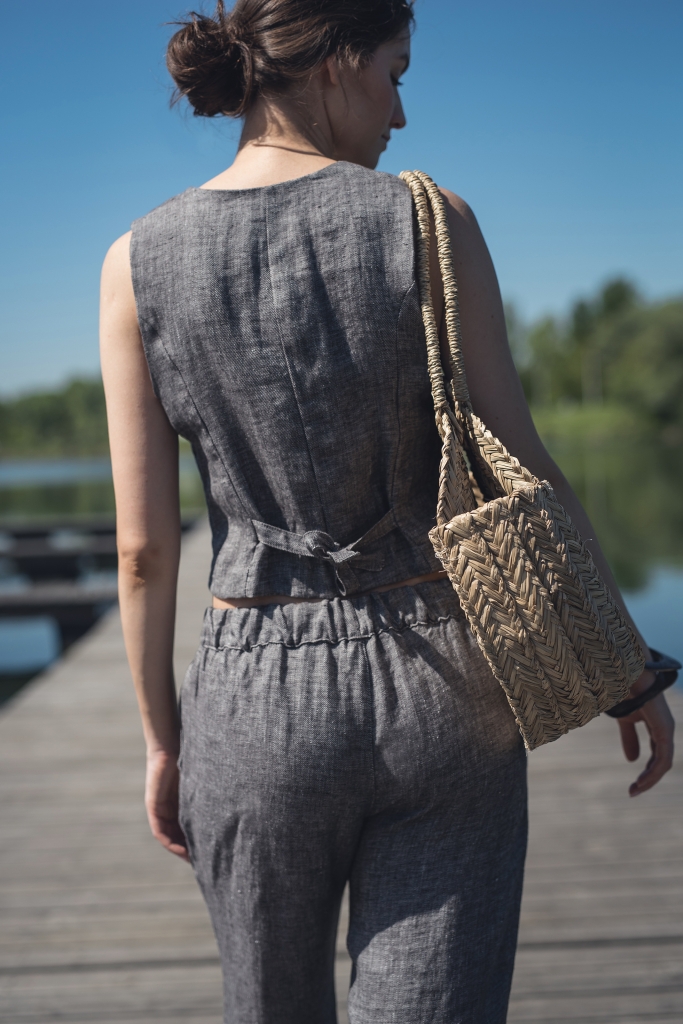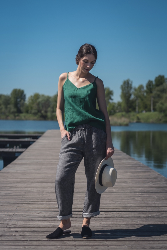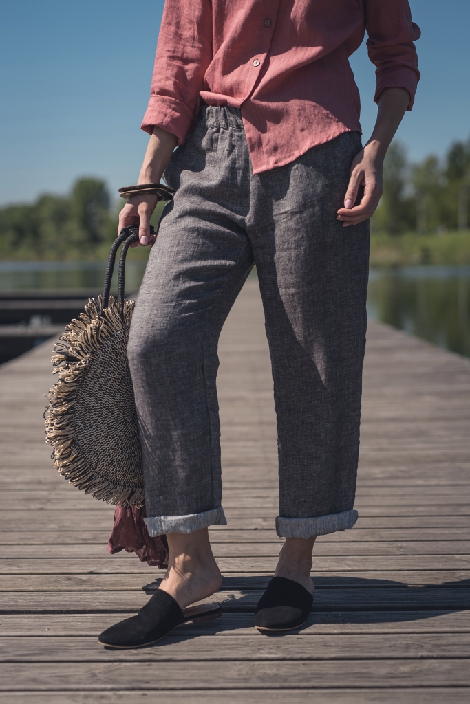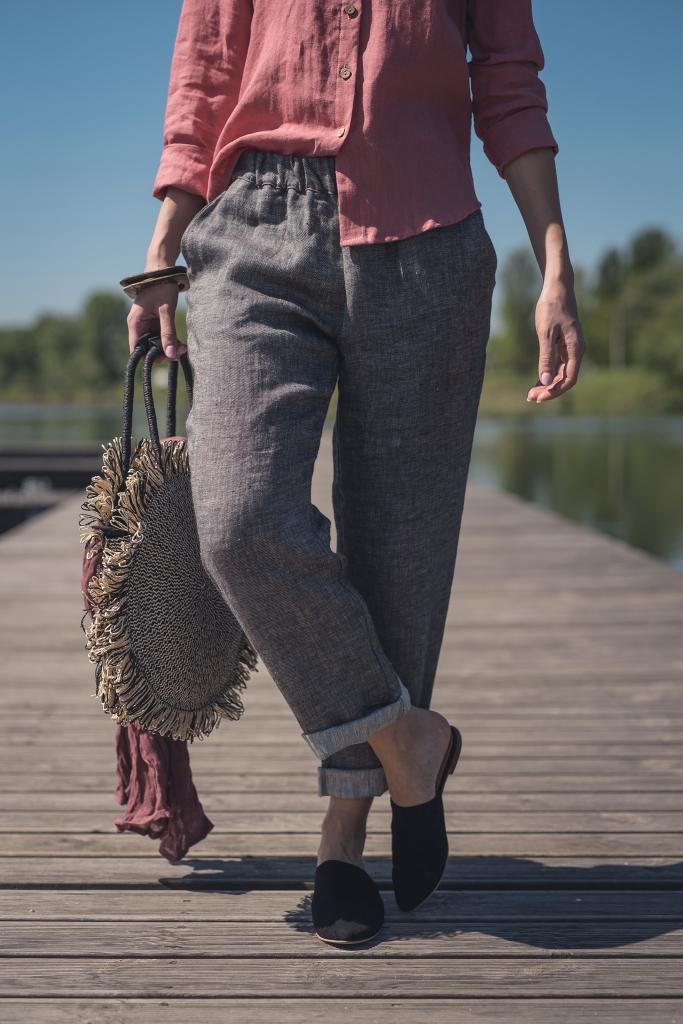 Lniane spodnie uszyte są z wyjątkowo mięciutkiej 100% tkaniny lnianej o splocie skośnym jednostronnym i gramaturze ~170g/m2 w kolorze melanż sól/pieprz.