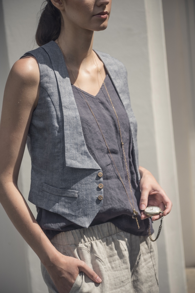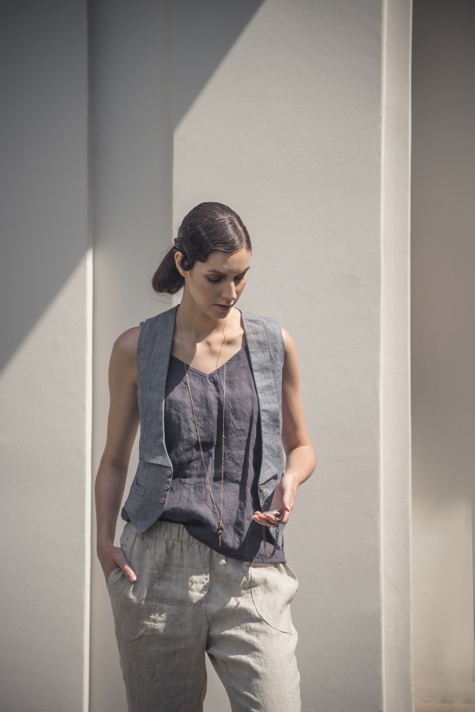 Top lniany na regulowanych ramiączkach w kolorze grafitowym, uszyty z 100% tkaniny lnianej. Pięknie prezentuje się z lnianymi spodniami, kamizelką oraz lnianą marynarką.