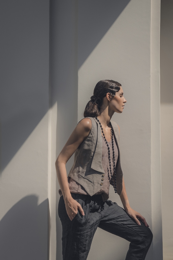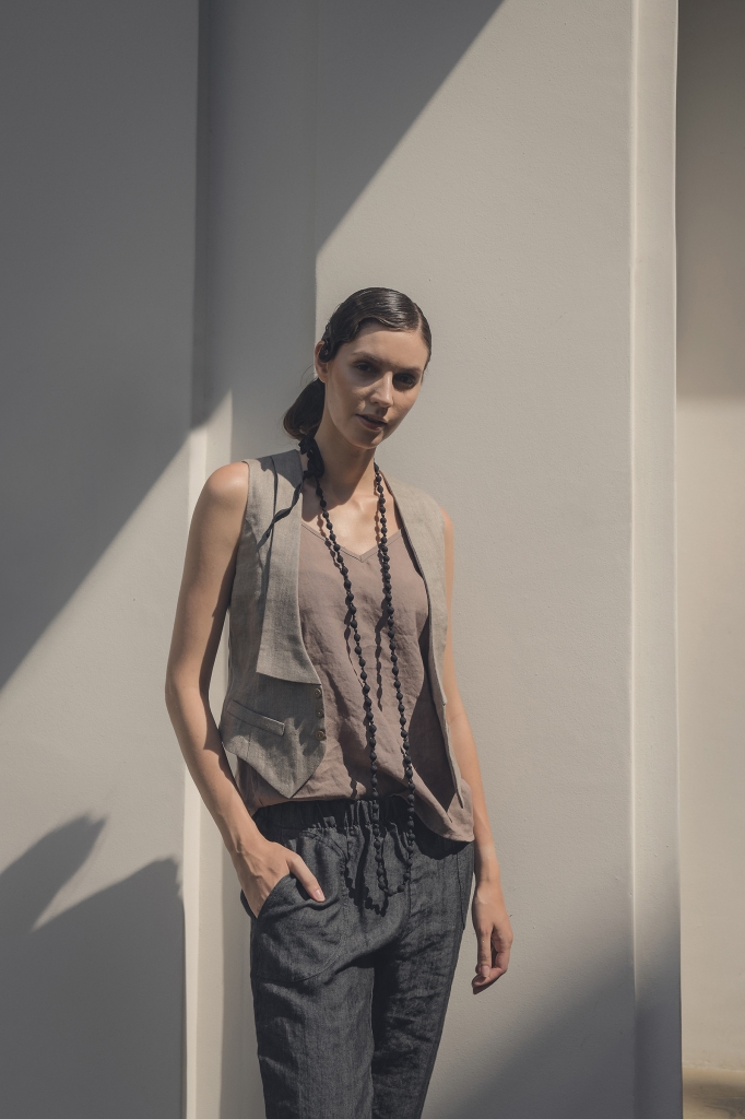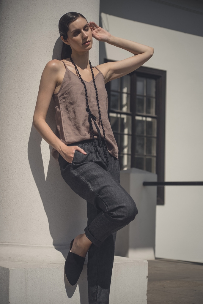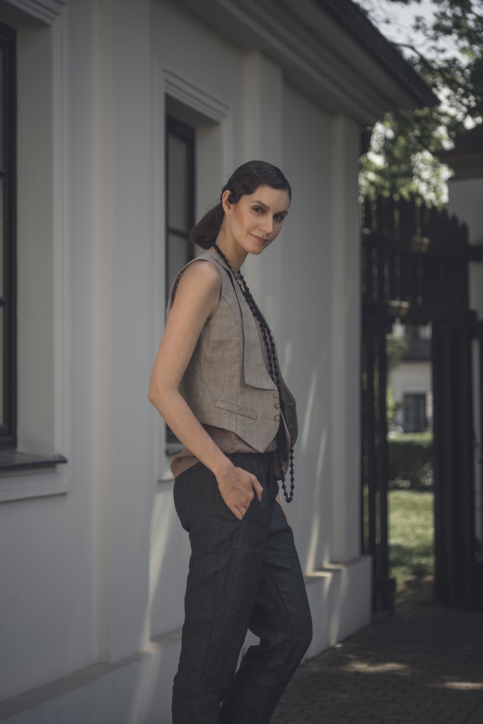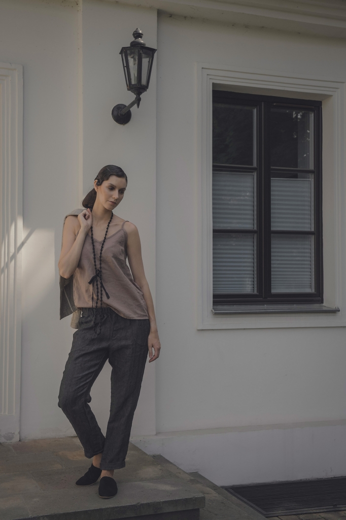 Top lniany na regulowanych ramiączkach w kolorze mlecznej czekolady, uszyty z 100% tkaniny lnianej. Pięknie prezentuje się z lnianymi spodniami, kamizelką oraz lnianą marynarką.