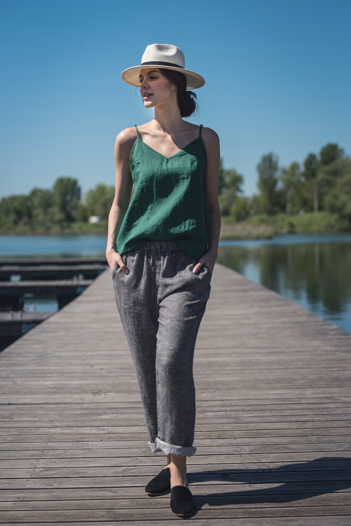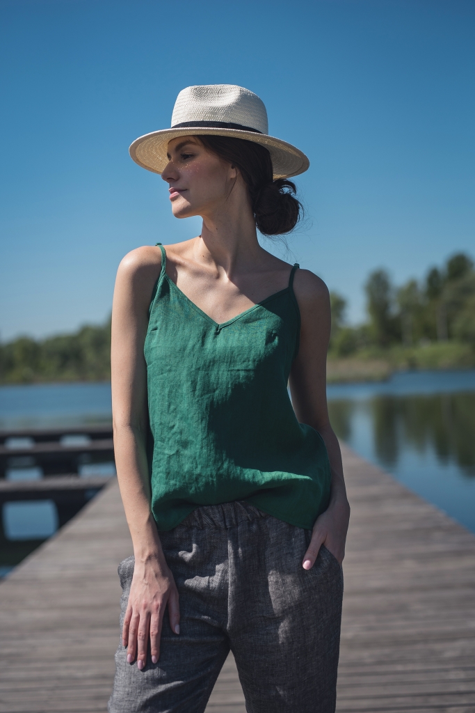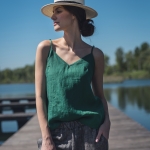 Top lniany na regulowanych ramiączkach w kolorze szmaragdowym, uszyty ze zmiękczanej 100% tkaniny lnianej. Pięknie prezentuje się z lnianymi spodniami, kamizelką oraz lnianą marynarką.
