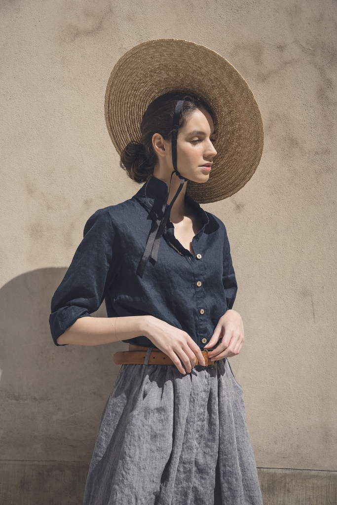 Spódnica lniana w kolorze grafitowego melanżu wykonana jest ze zmiękczanej tkaniny lnianej o gramaturze ~160 g/m2. Pasek spódnicy jest regulowany gumką o szerokości 3cm oraz paskiem lnianym zamocowanym w szlufkach co umożliwia dodatkowe regulowanie szerokości w talii. Na bokach znajdują się kieszenie, z tyłu suwak