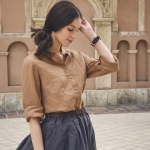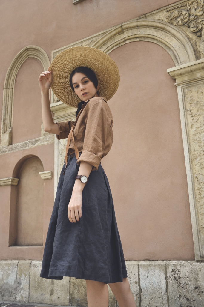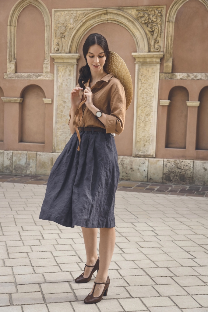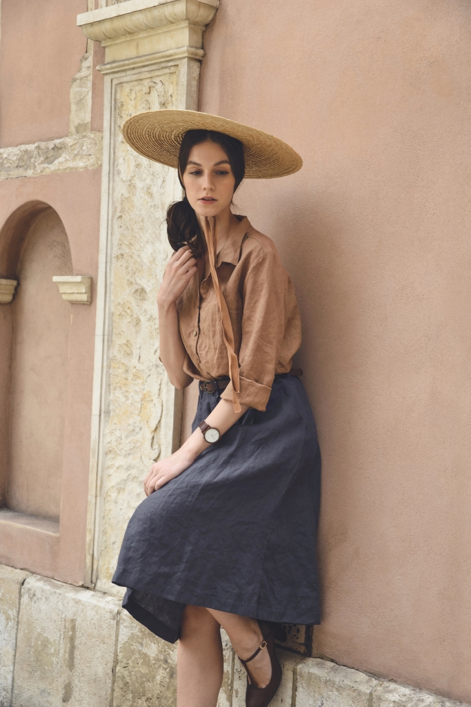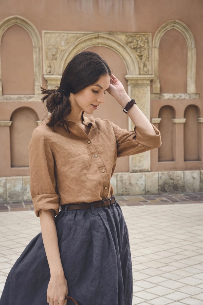 Koszula lniana w rozmiarze uniwersalnym, uszyta jest z przyjemnej w dotyku, zmiękczanej tkaniny lnianej w kolorze orzecha kokosowego o gramaturze ~150 g/m2.