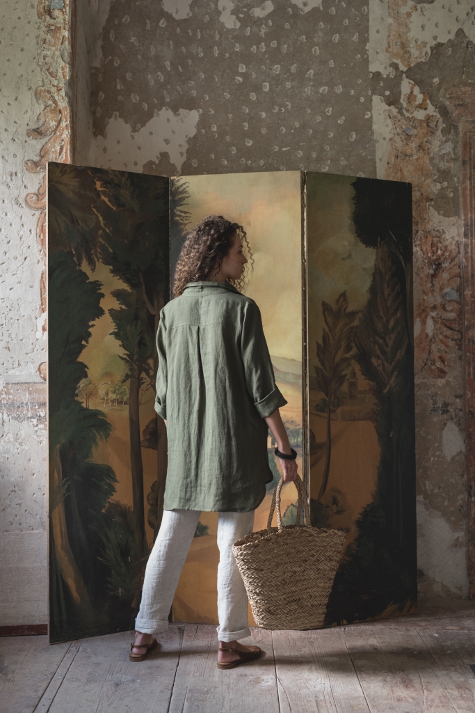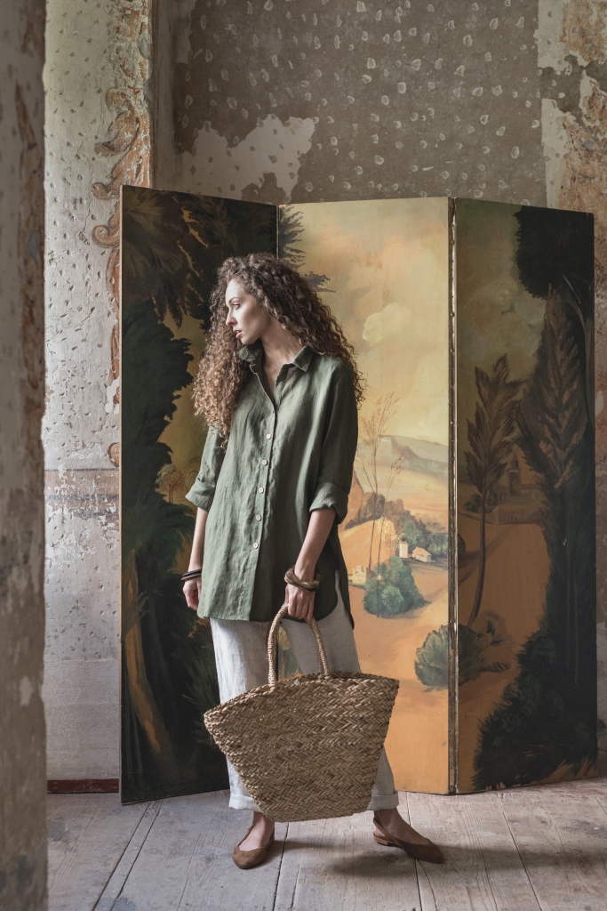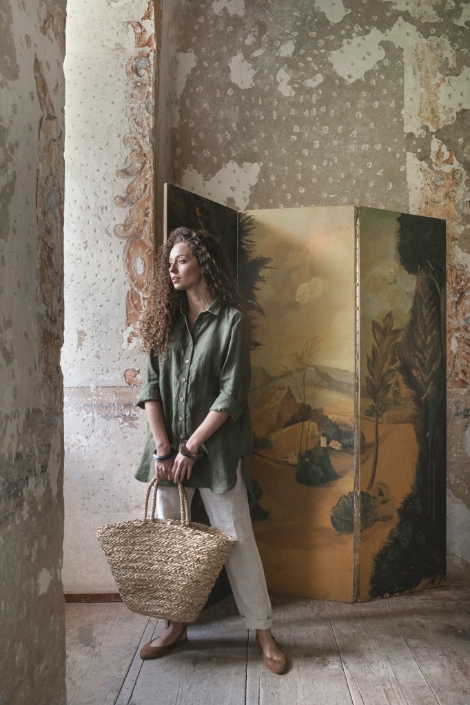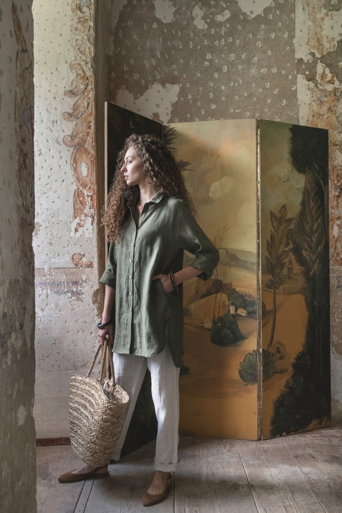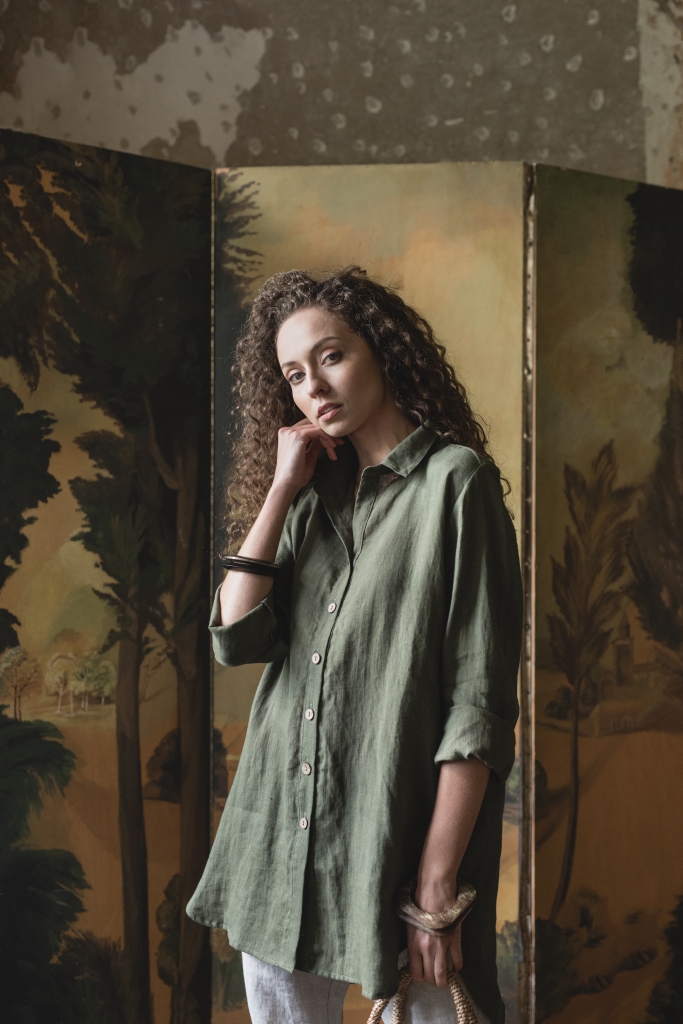 Tunika lniana w rozmiarze uniwersalnym z kieszeniami, uszyta jest z przyjemnej w dotyku, zmiękczanej tkaniny lnianej w kolorze oliwkowym o gramaturze ~170 g/m2.